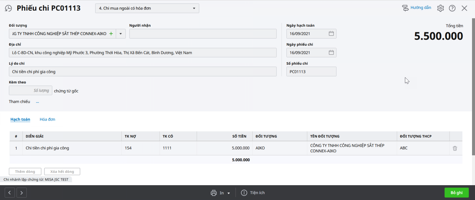 Bước 1: Vào phân hệ Tiền mặt\tab Thu, chi tiền, chọn chức năng Thêm\Chi tiền. Bước 2: Khai báo chứng từ phiếu chi về chi phí giá công đối với sản phẩm đi gia công kho. Bước 3: Nhấn Cất. ![]() Lưu ý: Kế toán cần chọn đối tượng THCP tương ứng. 2.5 Nhập kho thành phẩm gia công