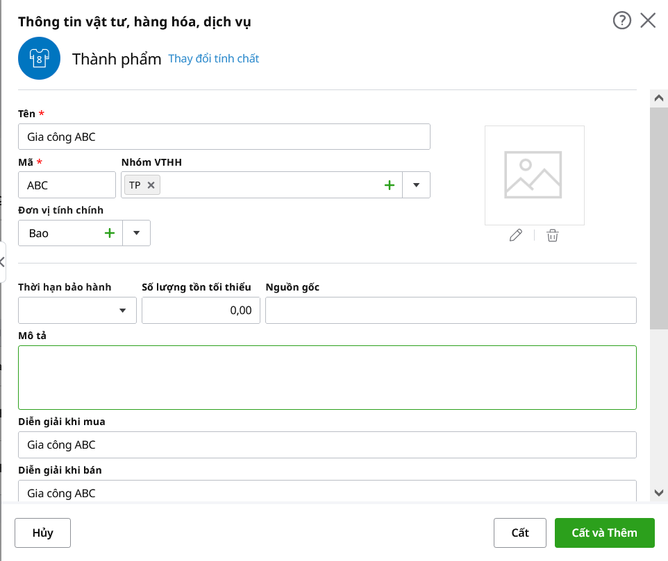 Bước 1: Vào Tiện ích và thiết lập\Tất các danh mục \Vật tư hàng hoá, chọn chức năng Thêm. Bước 2: Chọn tính chất hàng hoá dịch vụ là Thành Phẩm. Bước 3: Sau khi khai báo xong, nhấn Cất. ![]() Lưu ý: Khi khai báo thành phẩm, có thể thực hiện khai báo thêm định mức nguyên vật liệu sử dụng để sản xuất ra thành phẩm bên tab Định mức nguyên vật liệu. 2.2 Khai báo đối tượng tập hợp chi phí