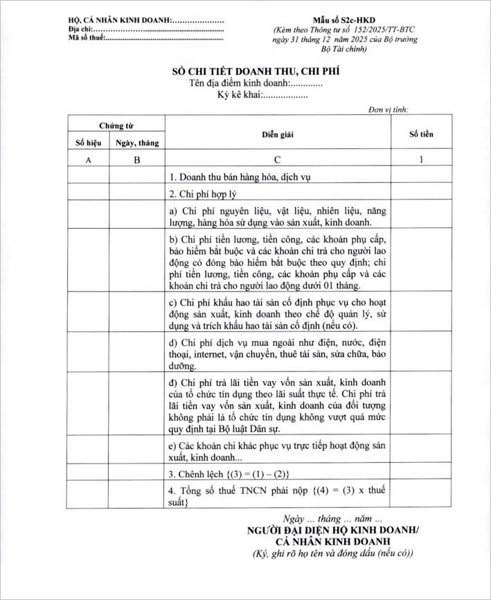 Mục đích: Hướng dẫn cách hạch toán chi phí đối với hộ kinh doanh nộp thuế thu nhập cá nhân trên thu nhập tính thuế (DT-CP) theo quy định tại thông tư 152/2025/TT-BTC, hiệu lực từ ngày 01/01/2026.