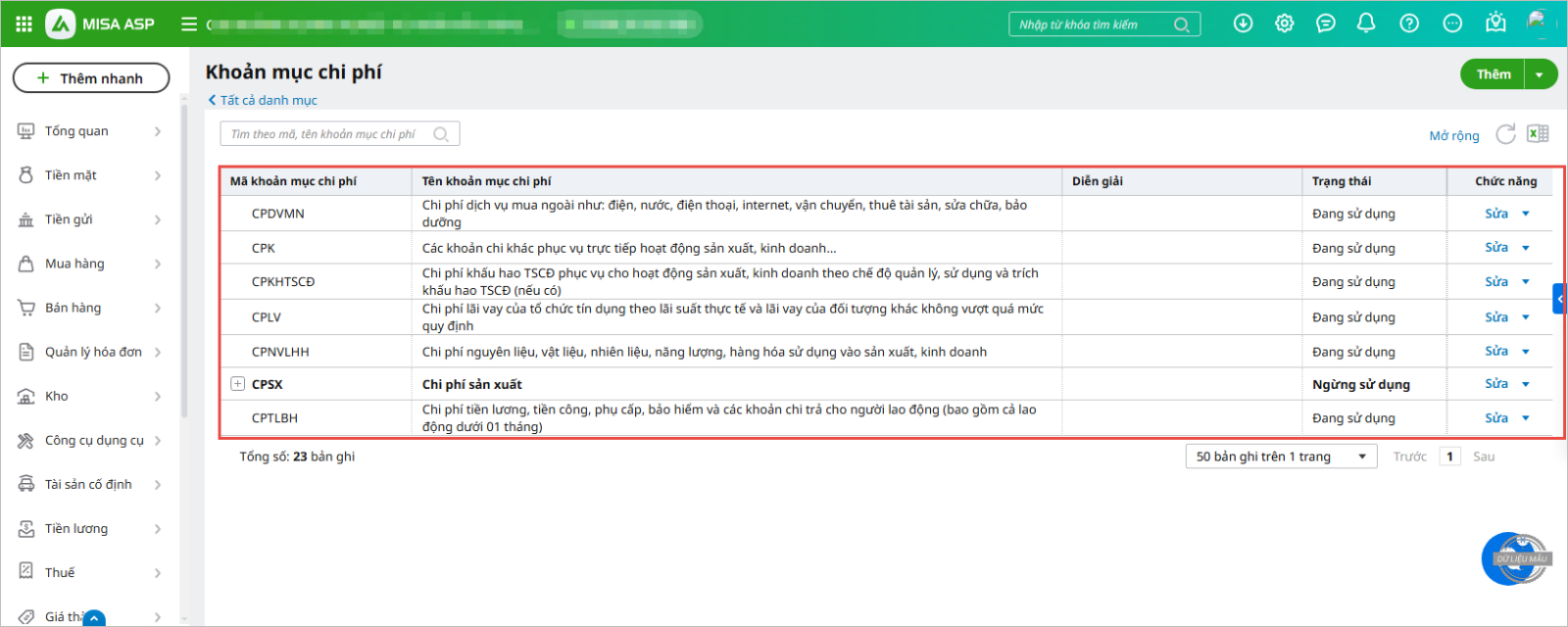 - Trên danh mục khoản mục chi phí, chương trình bổ sung các khoản mục theo quy định tại thông tư 152/2025/TT-BTC:
