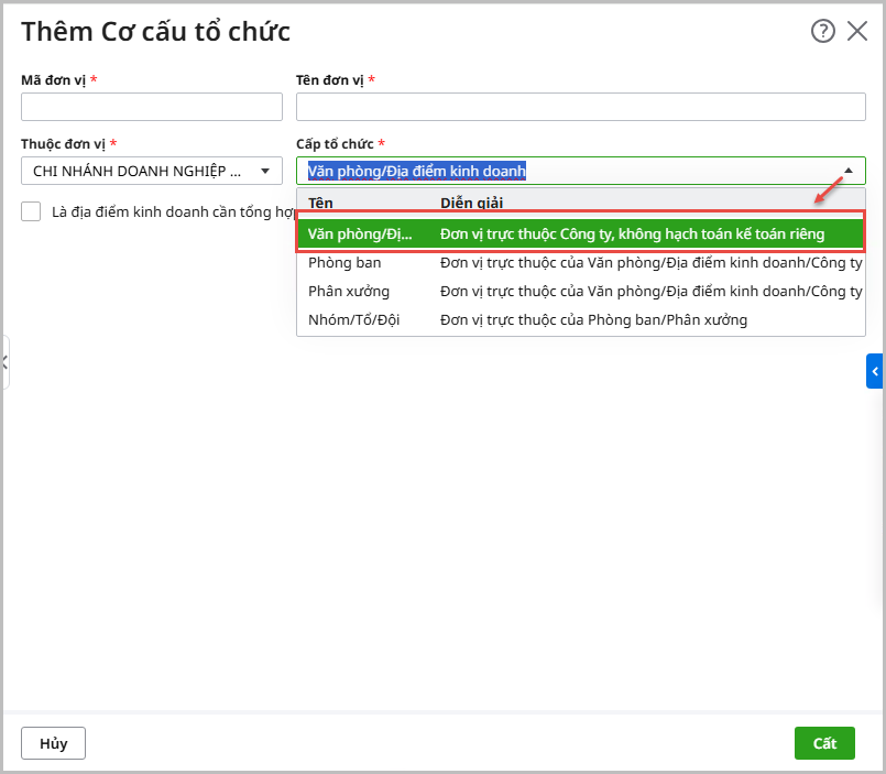 - Bước 1: Tại trường thông tin Cấp tổ chức, người dùng chọn “Văn phòng/Địa điểm kinh doanh”. Đây là lựa chọn bắt buộc để có thể khai báo thông tin kê khai thuế, Văn phòng/Địa điểm kinh doanh: