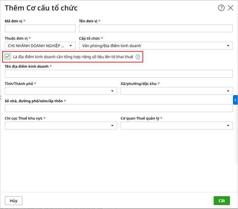 - Nhấn Cất để hoàn thành thiết lập. Chương trình sẽ tự động lấy dữ liệu của từng địa điểm kinh doanh trên các chứng từ để tổng hợp lên tờ khai theo đúng quy định.