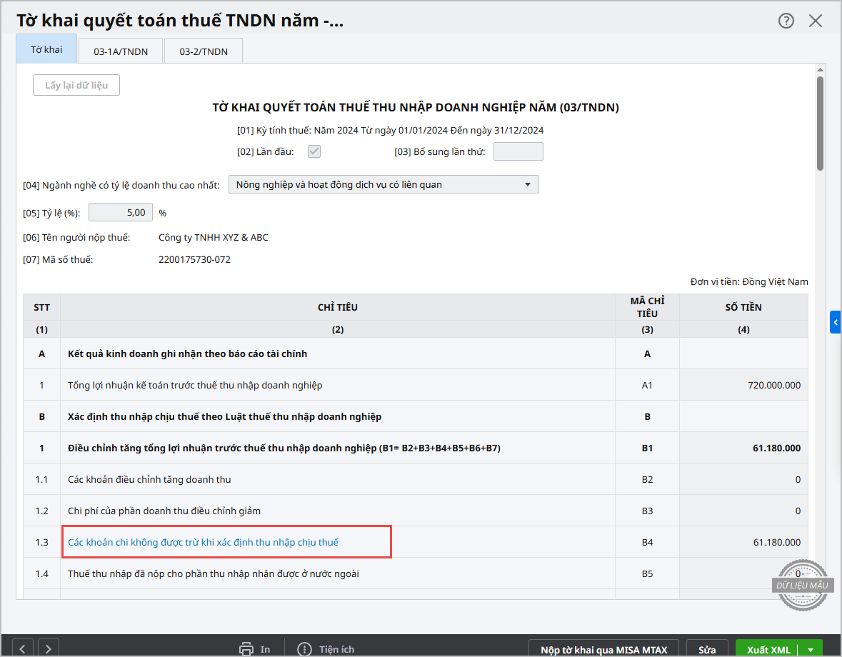 2.3. Phụ lục 03-1A/TNDN - Kết quả hoạt động sản xuất kinh doanh không lấy đủ số liệu