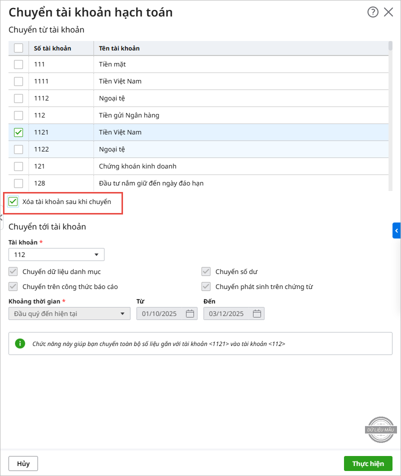 Lưu ý: Tích vào Xoá tài khoản sau khi chuyển để hệ thống tự động tích chọn vào các thông tin: Chuyển dữ liệu từ danh mụcChuyển số dưChuyển trên công thức báo cáoChuyển trên chứng từ. Đồng thời sau khi thực hiện xong chức năng chuyển tài khoản hạch toán, thông tin tài khoản bị chuyển đổi sẽ bị xoá trên danh sách hệ thống tài khoản.