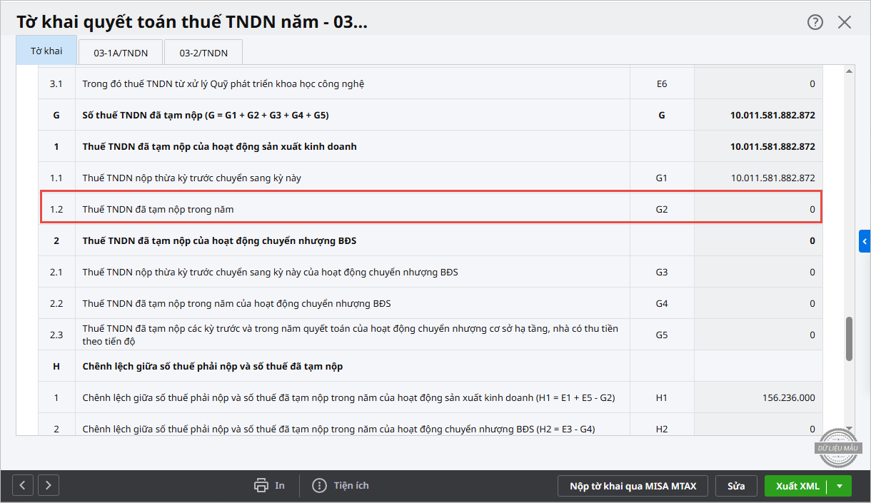 2.5. Chỉ tiêu G2 - Thuế TNDN đã tạm nộp trong năm không lấy số liệu