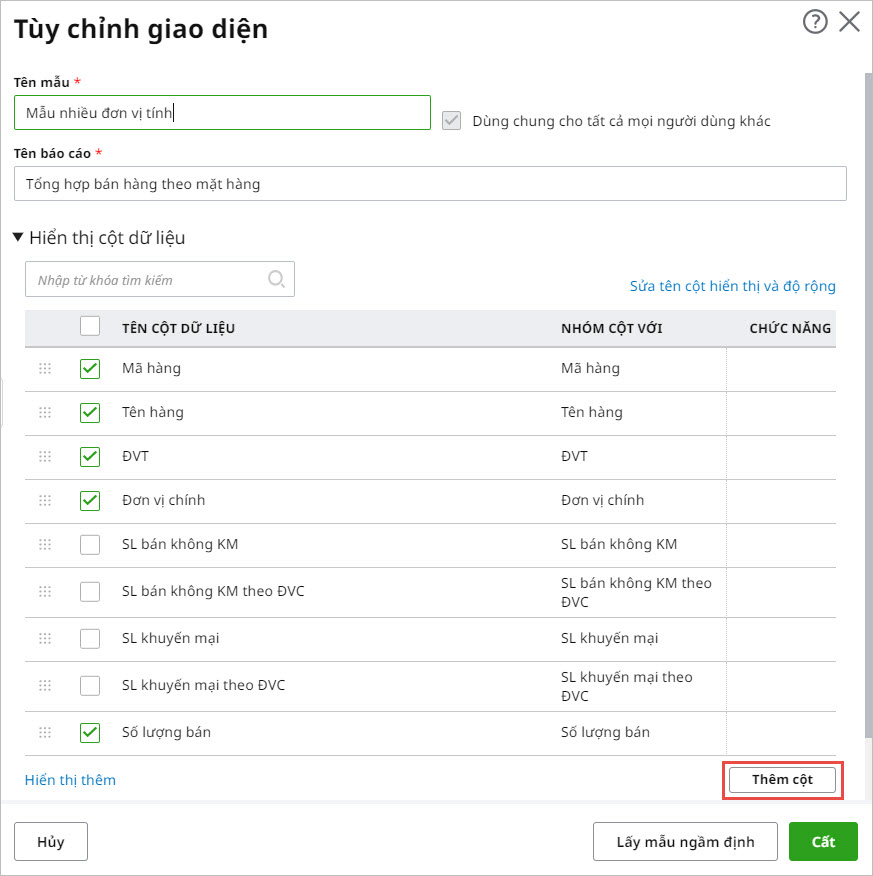 Bước 5: Sau khi thêm cột và tích chọn hiển thị cột vừa thêm thì nhấn “Cất” để lưu lại trên mẫu và quay lại màn hình báo cáo sẽ có cột vừa thêm.