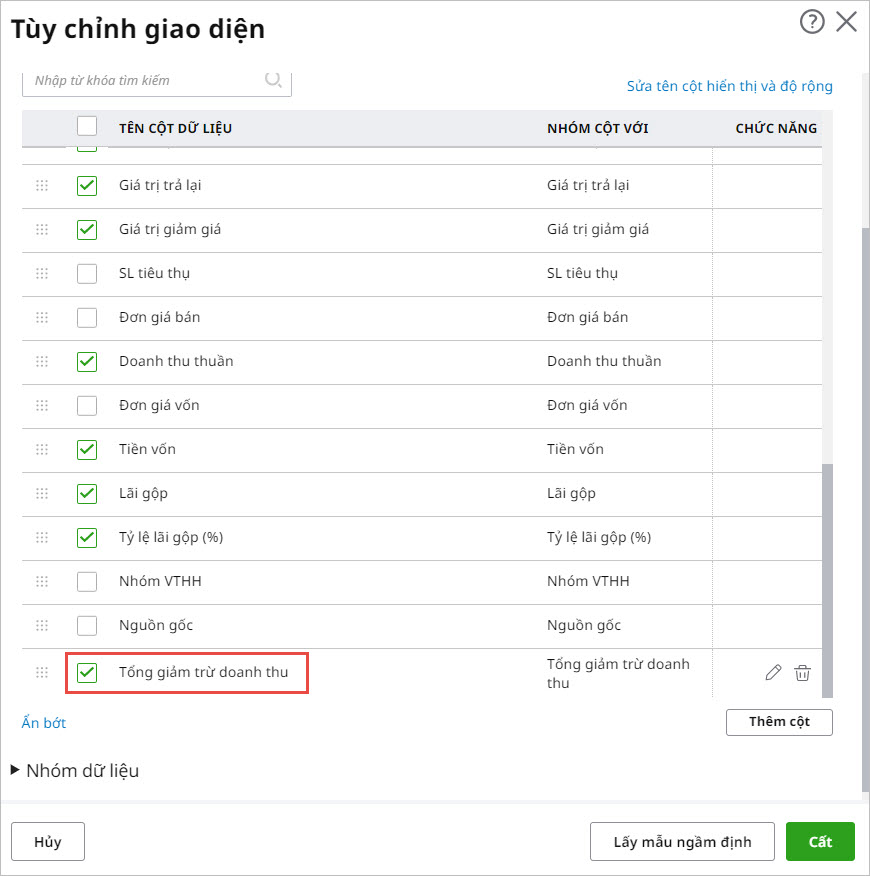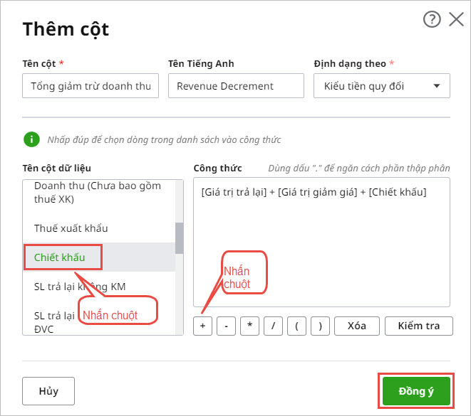 • Nhập tên cột, VD: Tổng giảm trừ doanh thu