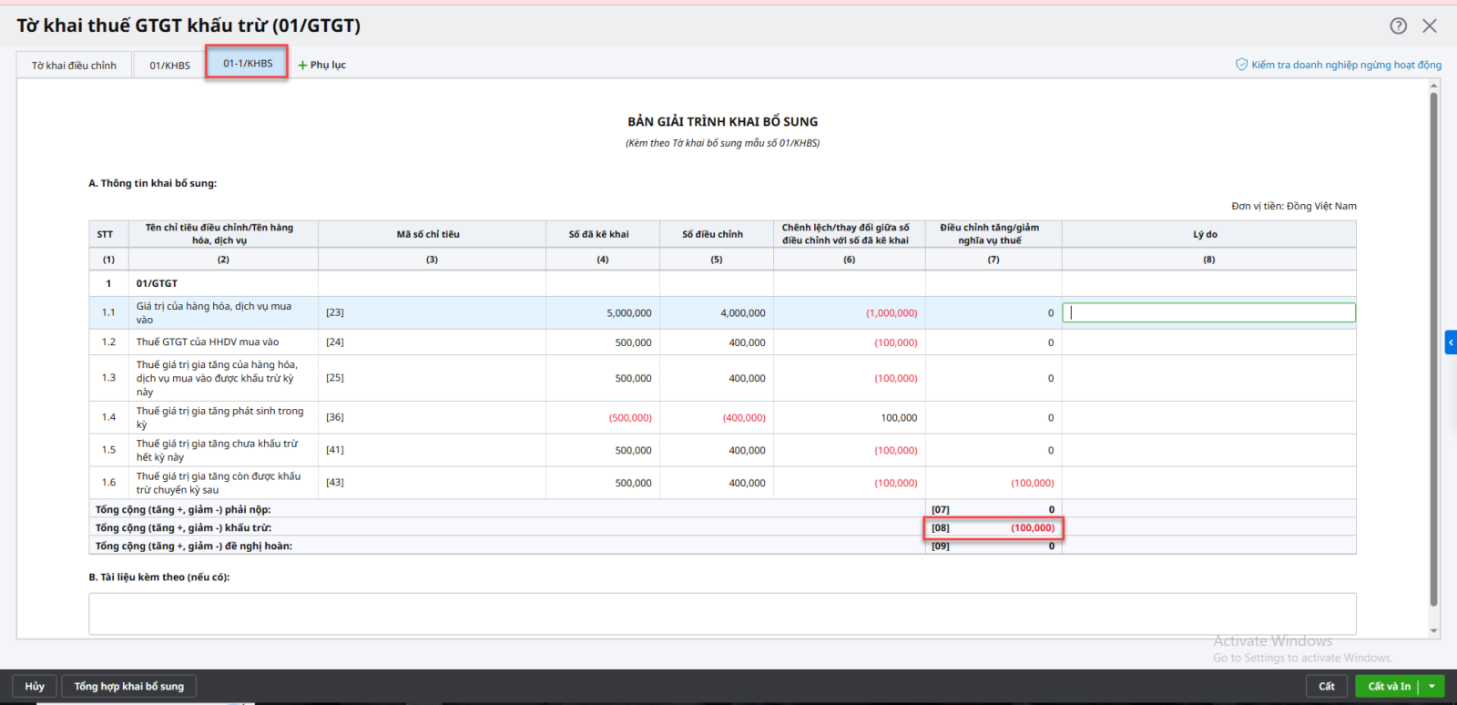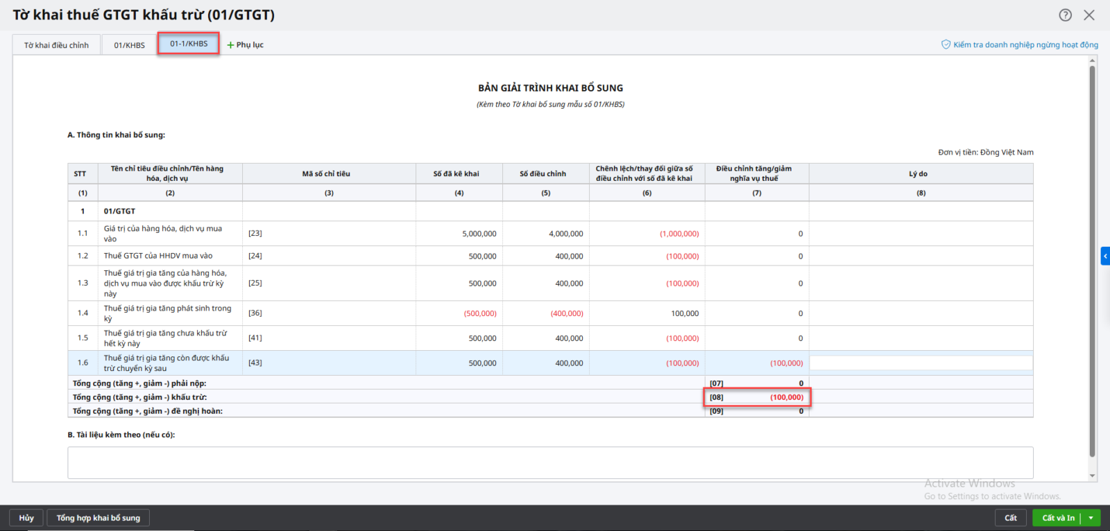 Biểu hiện: Tờ khai thuế GTGT lần đầu còn số thuế được khấu trừ chuyển kỳ sau (chỉ tiêu 43). Khi lập Tờ khai bổ sung thuế GTGT, trên Bản giải trình bổ sung (01-1/KHBS) chỉ tiêu Tổng cộng (tăng +, giảm -) khấu trừ [08] < 0 (giảm số thuế khấu trừ được chuyển qua kỳ sau)