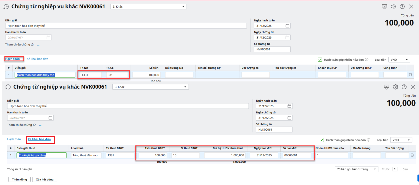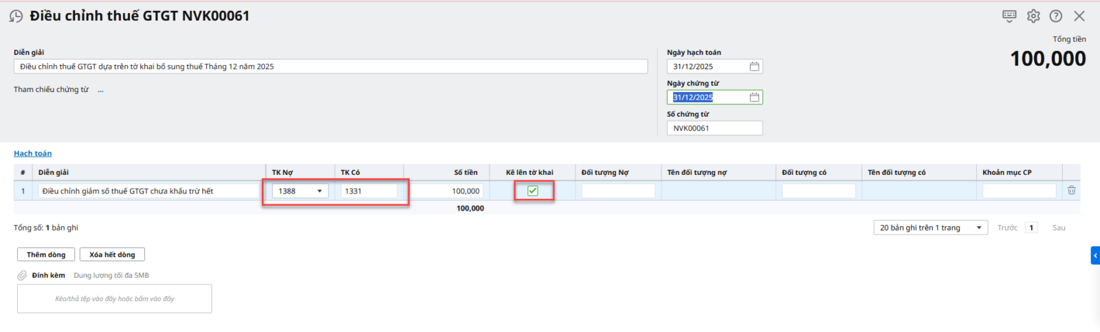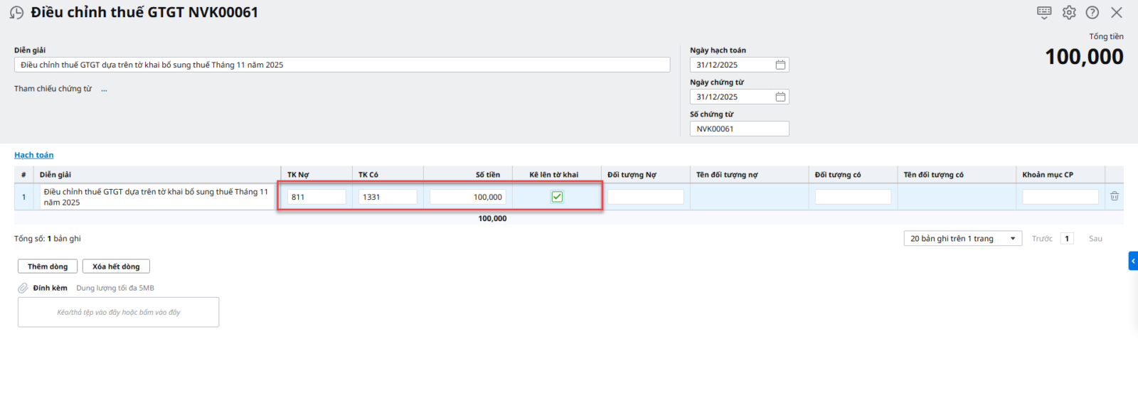 Trường hợp 2: Nếu bạn muốn số dư TK 33311 bằng 0 để khớp với chỉ tiêu số thuế phải nộp (chỉ tiêu 40) trong tờ khai lần đầu.