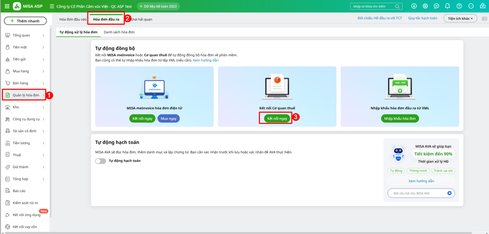 Bước 1: Trên phân hệ Quản lý hóa đơn\ chọn tab Hóa đơn đầu ra\ Chọn tab tự động xử lý hóa đơn, bấm chọn Kết nối cơ quan thuế.
