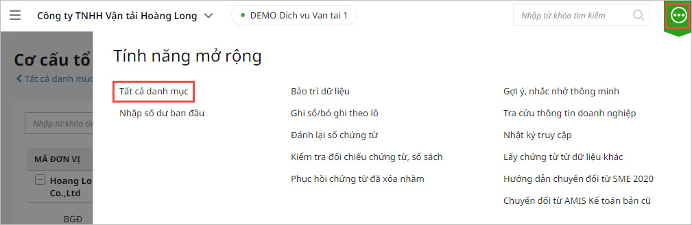 Bước 1: Vào Tính năng mở rộng, chọn Tất cả danh mục: