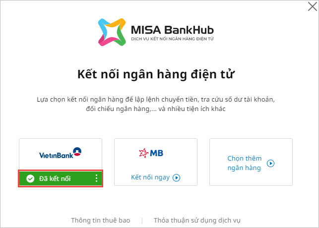 Lưu ý: Trường hợp trong Danh mục\Tài khoản ngân hàng chỉ có tài khoản VietinBank là tài khoản của Ngân hàng có liên kết với MISA thì sẽ không có bước chọn Ngân hàng kết nối mà chương trình sẽ ngầm định tài khoản kết nối là tài khoản VietinBank.