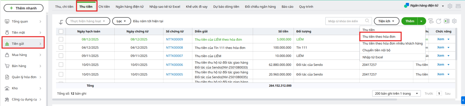 Bước 1: Vào phân hệ Tiền gửi\tab Thu tiền, chọn mũi tên ⏷ bên cạnh chức năng Thêm\Thu tiền theo hóa đơn.