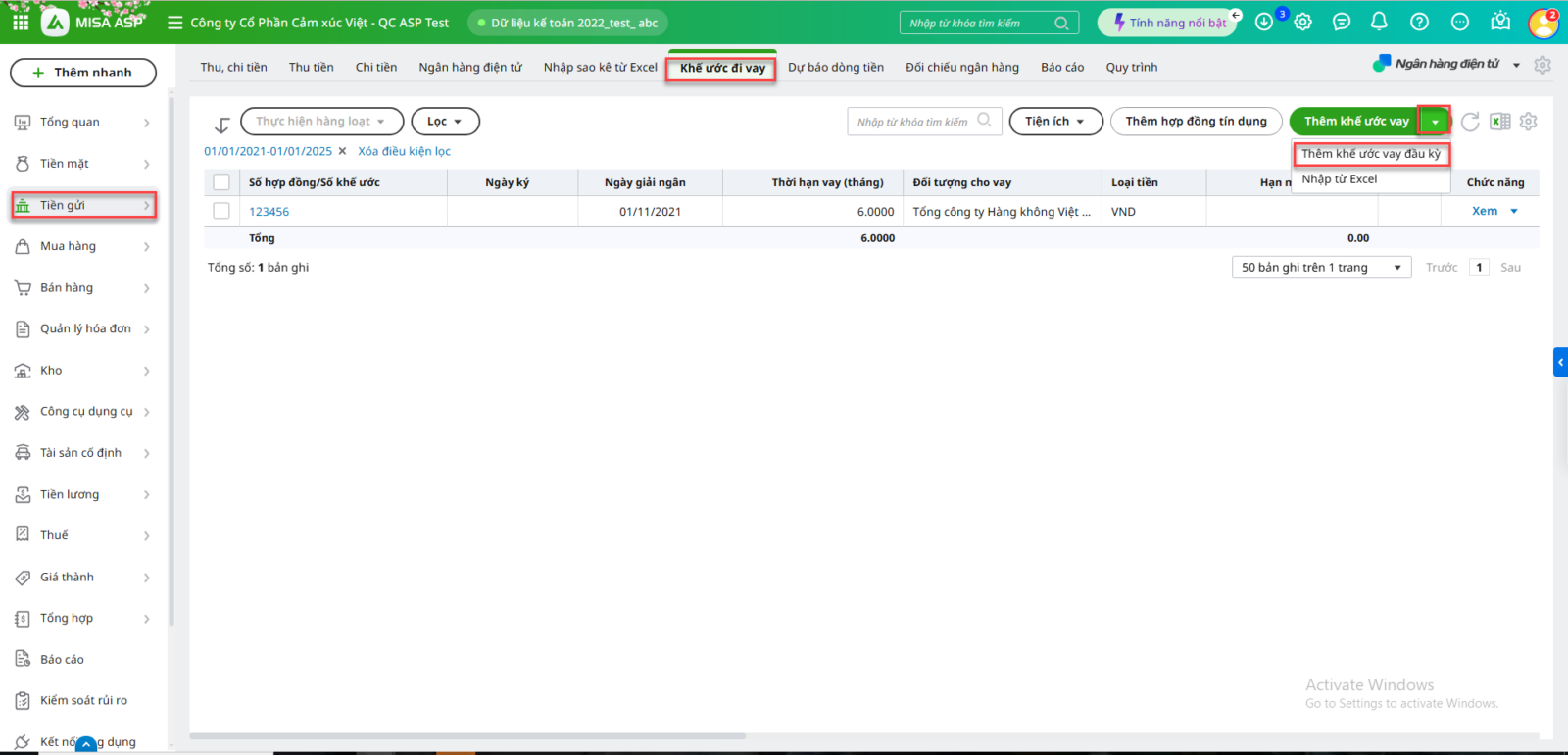 2.1 Khai báo Khế ước vay/Hợp đồng tín dụng đầu kỳ (nếu có)Bước 1: Vào phân hệ Tiền gửi, tab Khế ước cho vay, chọn Thêm khế ước cho vay đầu kỳ: