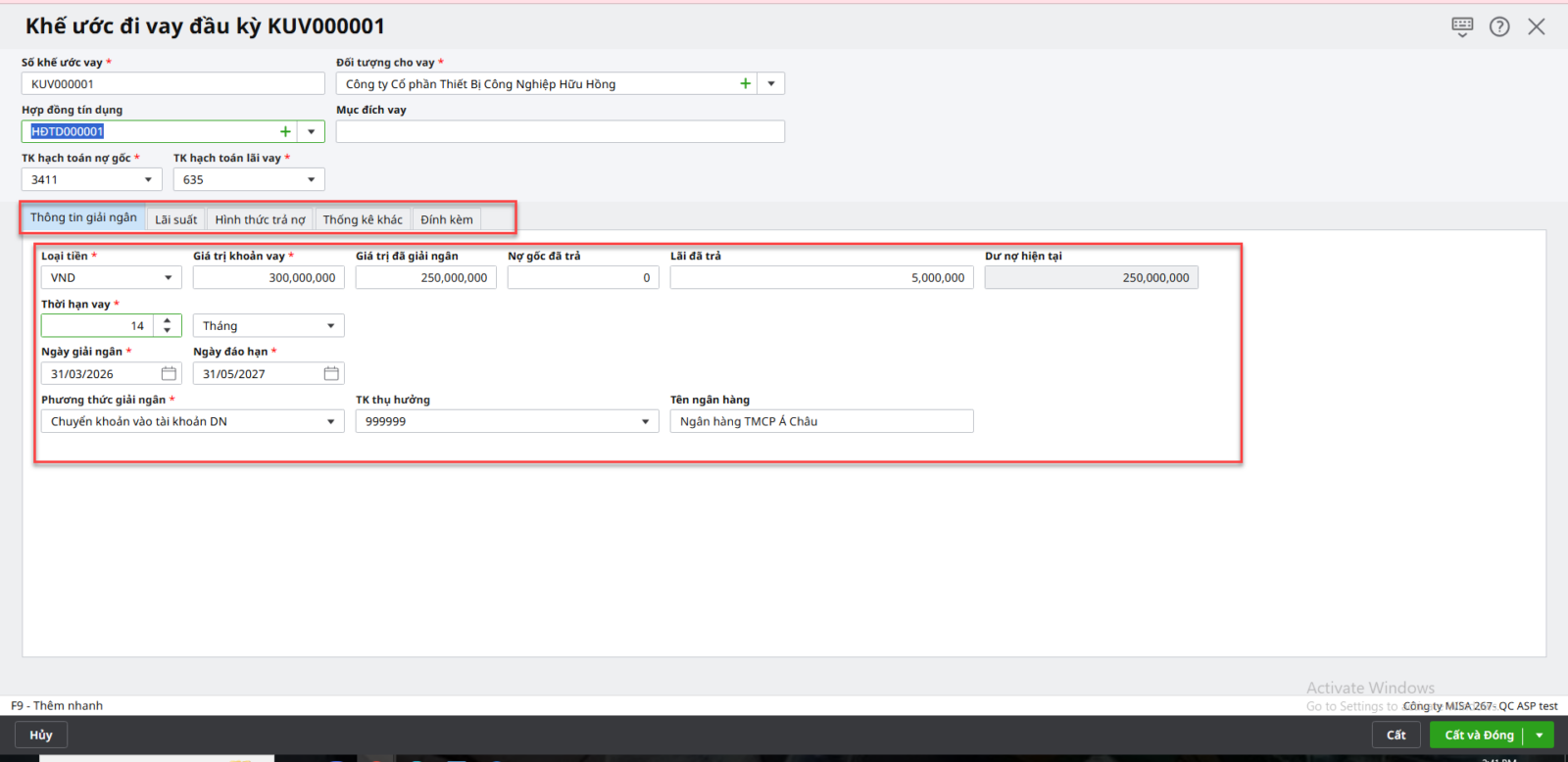 Bước 2: Khai báo các thông tin chung về khế ước cho vay đầu kỳ Bước 3: Khai báo thông tin giải ngân, lãi suất, hình thức thu nợ của khế ước cho vay đầu kỳ Bước 4: Nhấn Cất