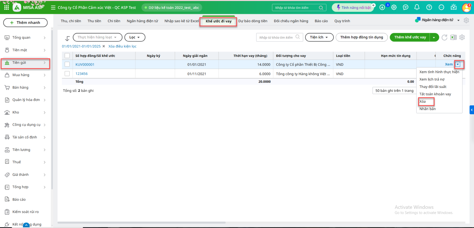 Lưu ý: Để xóa Khế ước vay/Hợp đồng tín dụng đầu kỳ thì vào phân hệ Tiền gửi/ tab Khế ước cho vay/ cột Chức năng, chọn Xóa.