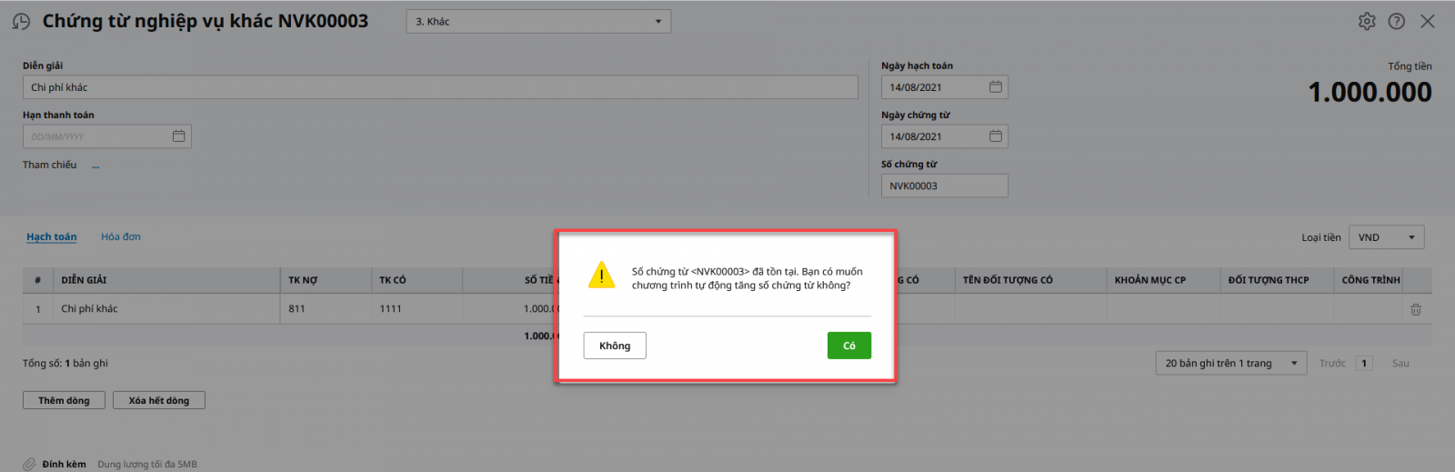 Biểu hiện: Khi ghi sổ các loại chứng từ báo “Số chứng từ <…..> đã tồn tại. Bạn có muốn chương trình tự động tăng số chứng từ không?”