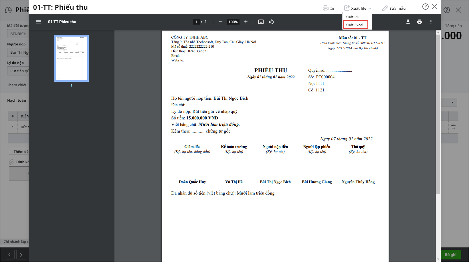 Nội dung bài viết bao gồm phạm vi các chứng từ hỗ trợ xuất Excel và ví dụ minh họa trên chứng từ phiếu thu.