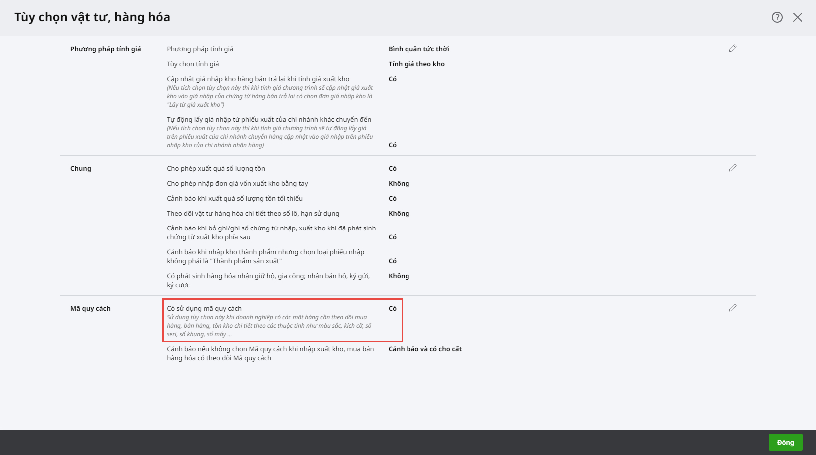 Để thực hiện chức năng này, người dùng cần tích chọn Có sử dụng mã quy cách trên Thiết lập\Tùy chọn\Tùy chọn vật tư hàng hóa:
