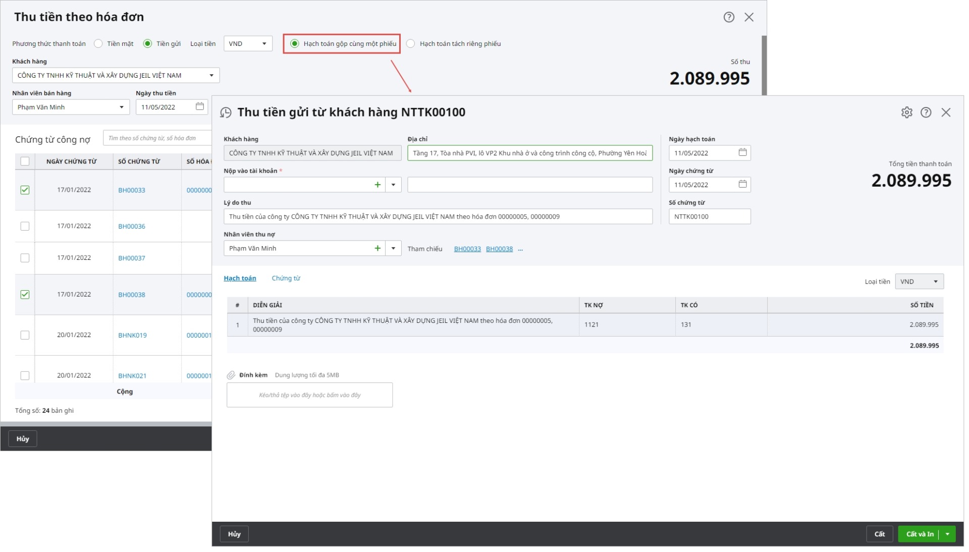 - Giới thiệu tính năng lựa chọn hạch toán gộp hoặc tách riêng phiếu khi thu tiền theo hóa đơn.