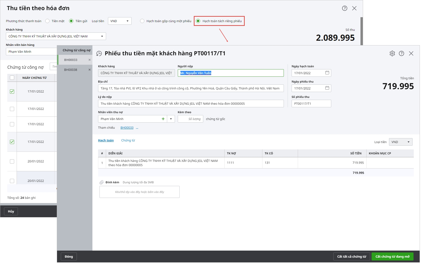 - Nếu người dùng tích chọn Hạch toán tách riêng phiếu thì chương trình sẽ hạch toán tách riêng mỗi hóa đơn thành 1 chứng từ thu tiền: