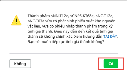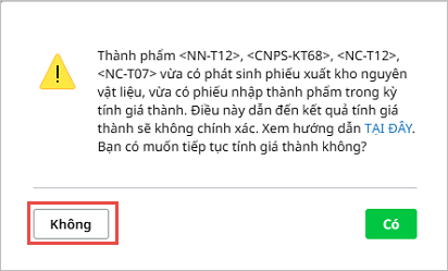 Nhận biết lỗi: Khi thực hiện tính giá thành, chương trình xuất hiện cảnh báo: