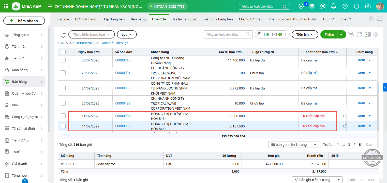- Đối với các hóa đơn bị cơ quan Thuế từ chối cấp mã, người dùng cần thực hiện kiểm tra lại nguyên nhân từ chối cấp mã và lập lại hóa đơn mới. Xem theo hướng dẫn lập hóa đơn mới tại đây.