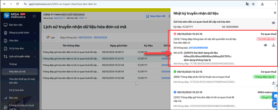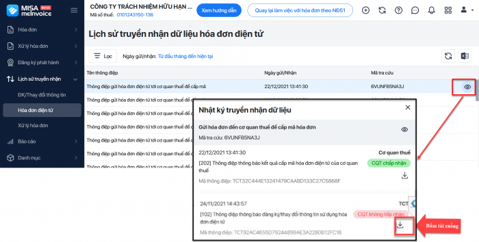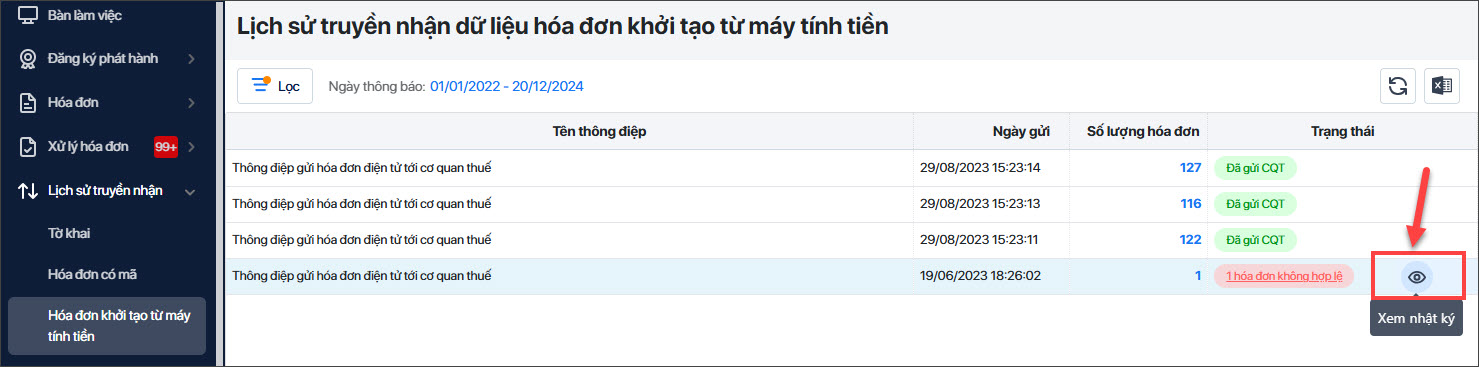 Bước 2: Trên giao diện Lịch sử truyền nhận, tại dòng thông điệp của Số hoá đơn bị CQT từ chối cấp mã hoặc Không hợp lệ, bấm biểu tượng
