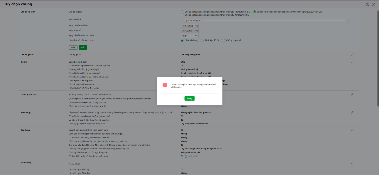- Tại mục Chế độ kế toán: Không cho phép người dùng thay đổi thông tư: