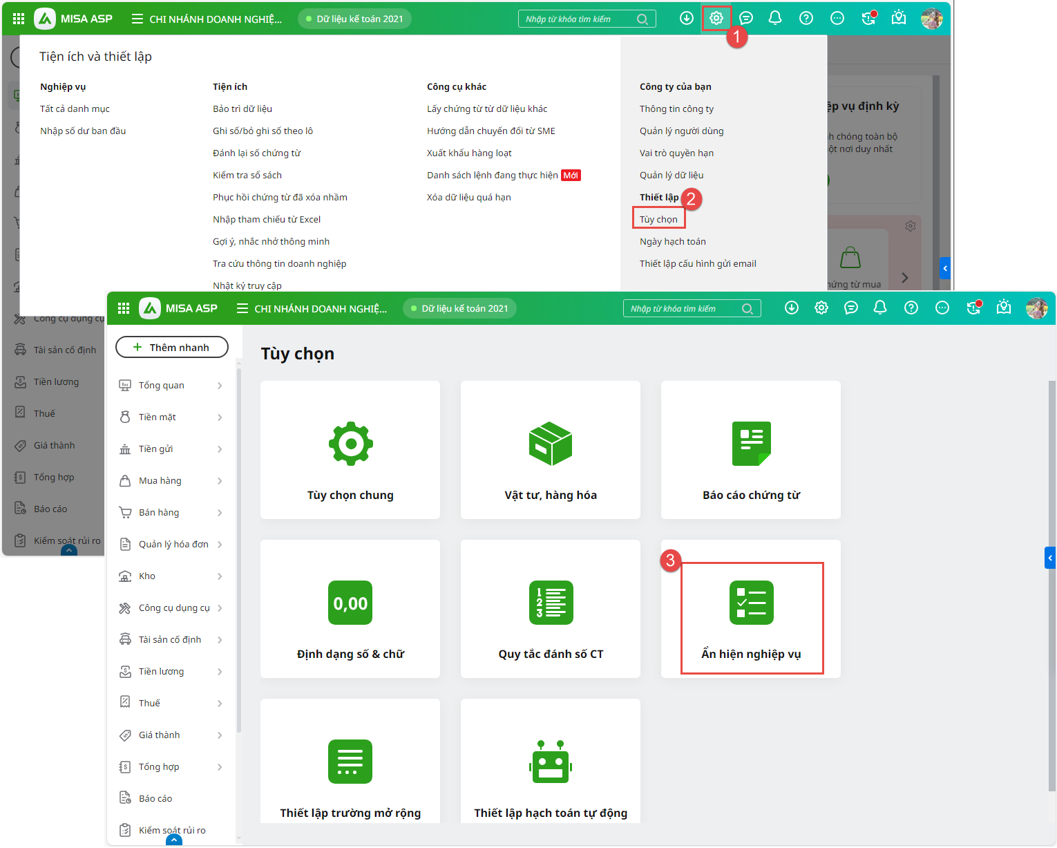 - Vào menu Tiện ích và thiết lập/ Tùy chọn/ Ẩn hiện nghiệp vụ
