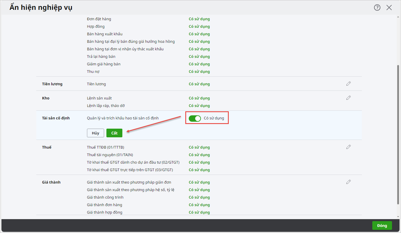 - Tại phân hệ cần hiển thị chọn Có sử dụng, nhấn Cất