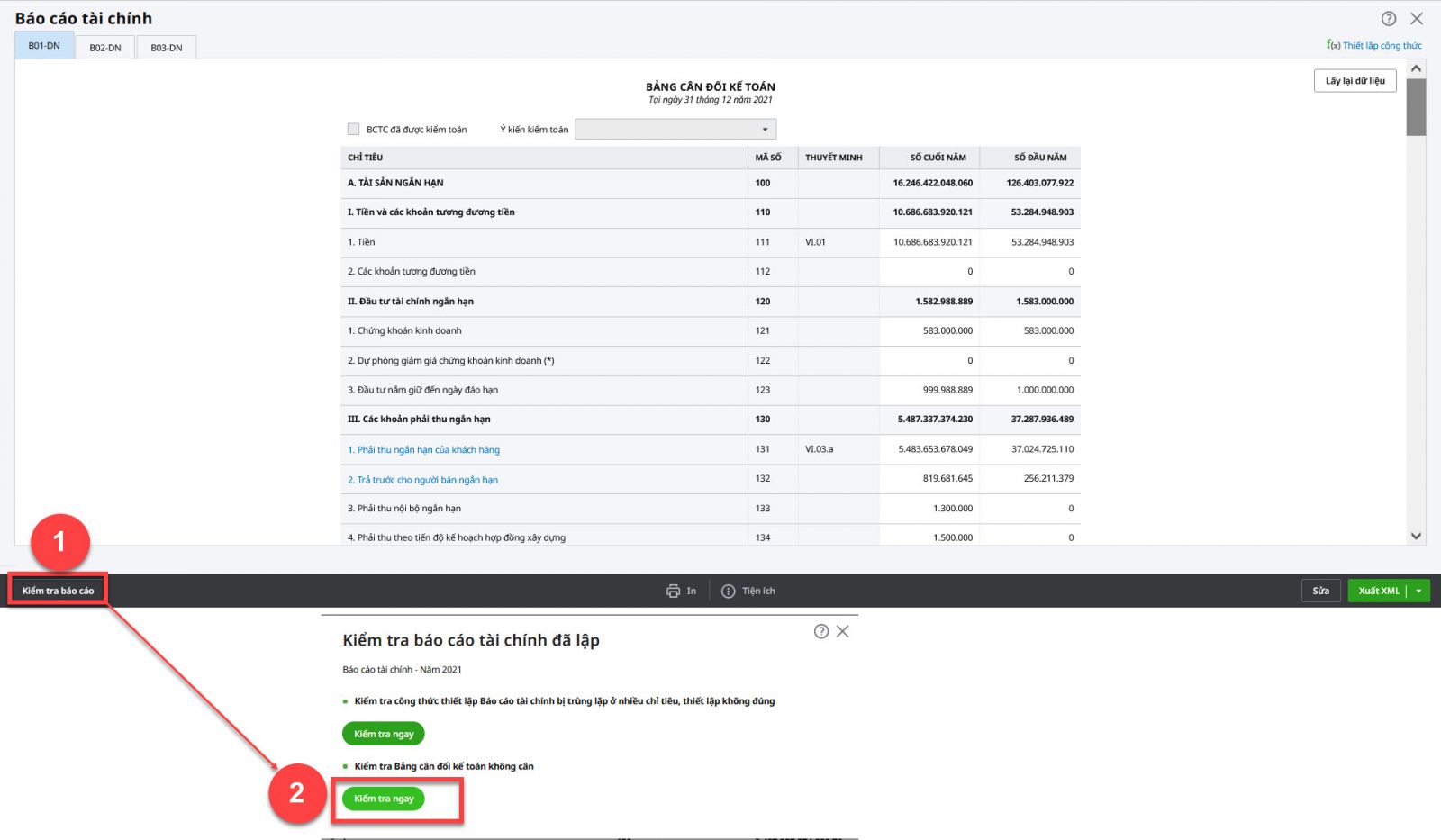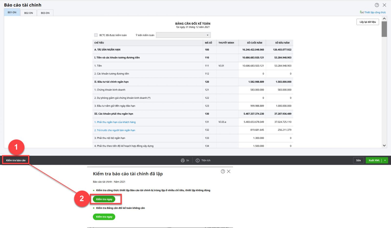 2.1 Kiểm tra công thức thiết lập báo cáo tài chính2.2. Kiểm tra bảng cân đối kế toán/Báo cáo tình hình tài chính không cân