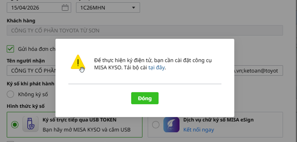 Biểu hiện: Khi ký hóa đơn, phần mềm hiển thị cảnh báo lỗi “Để thực hiện ký điện tử, bạn cần cài đặt công cụ MISA KYSO. Tải bộ cài tại đây” hoặc “Ký số không thành công”.