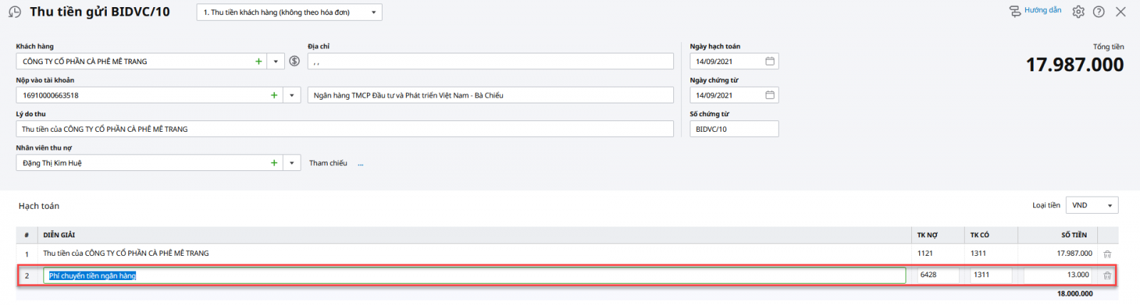 2.2 Hạch toán phí chuyển tiền khi thu tiền khách hàng