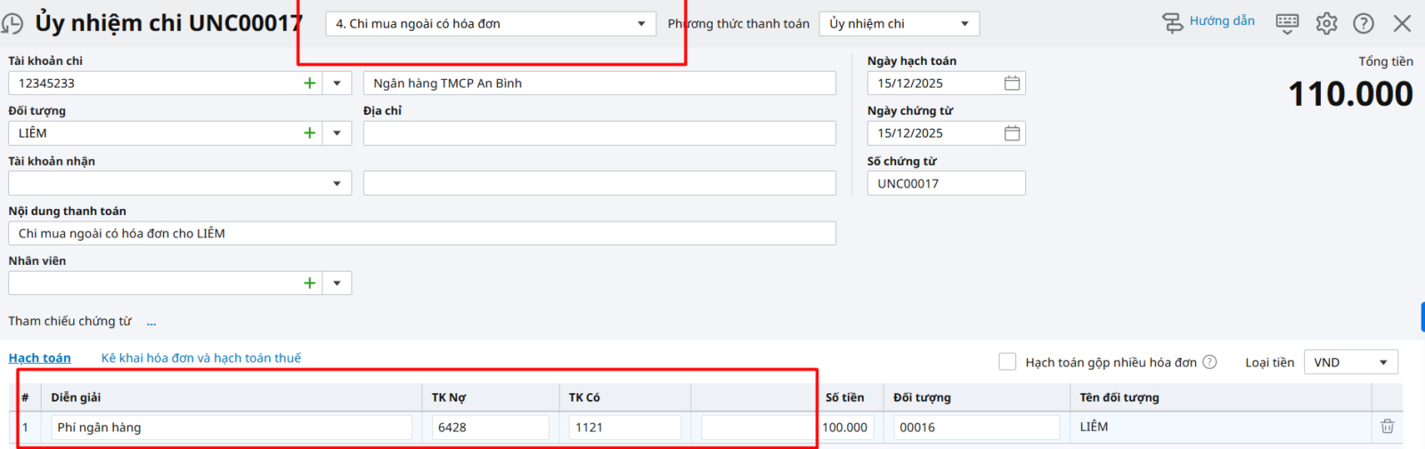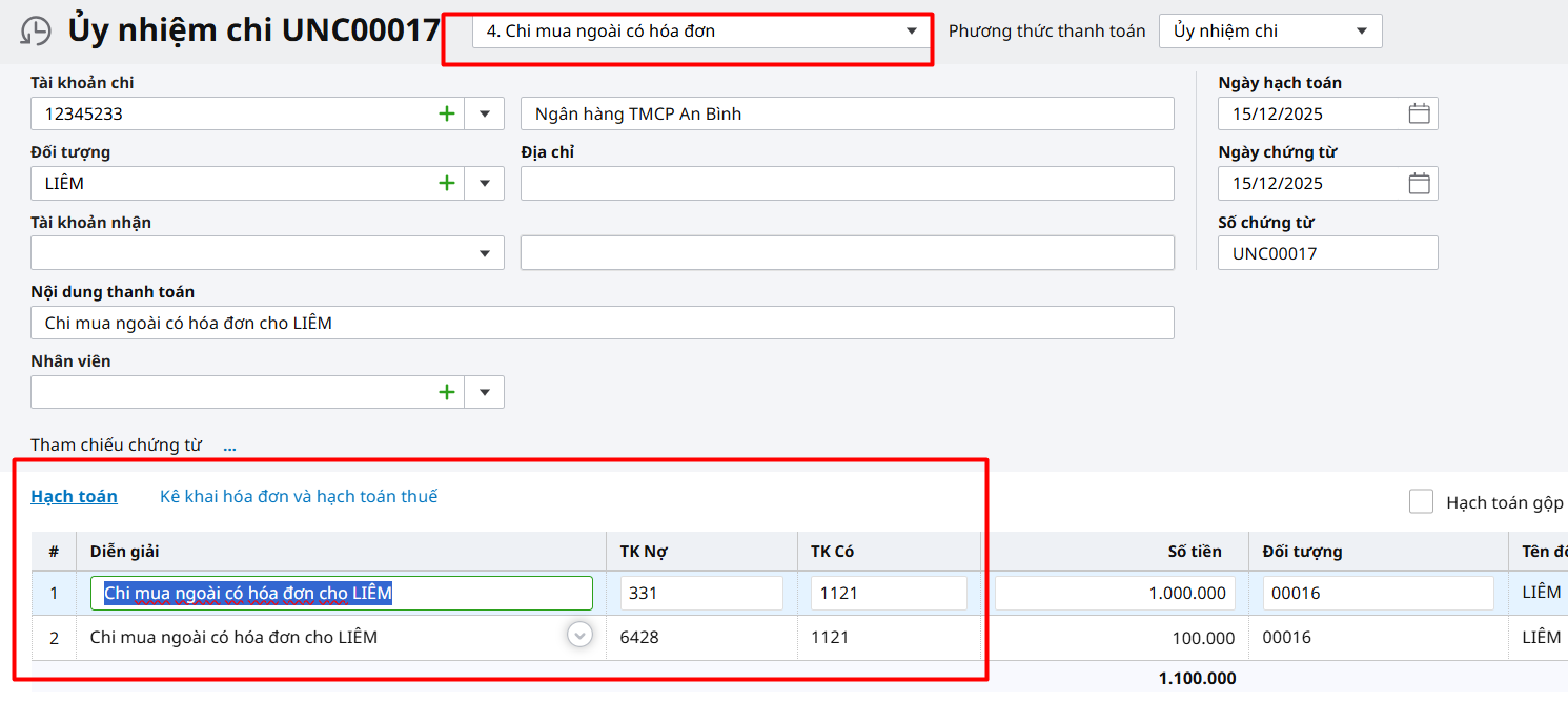 Ví dụ: Trả tiền nhà cung cấp: 70.000.000, phí chuyển tiền: 13.000. Hạch toán bút toán Nợ TK331 / Có TK112: 70.000.000 Nợ TK6428 / Có TK112: 13.000 – Cách 1: Nếu lập chung 1 chứng từ ủy nhiệm chi Bước 1: Thêm mới chứng từ Ủy nhiệm chi, chọn loại “Trả tiền nhà cung cấp (không theo hóa đơn) ”. Bước 2: Trên Ủy nhiệm chi, tại tab Hạch toán, bạn hạch toán 2 dòng: