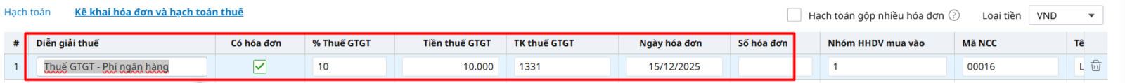 Bước 3: Tại tab Kê khai hóa đơn và hạch toán thuế, dòng 2 tích vào ô “Có hoá đơn” và nhập các thông tin của Hoá đơn phí chuyển tiền (% Thuế, Ngày HĐ, Số HĐ, Nhà cung cấp là Ngân hàng,…)