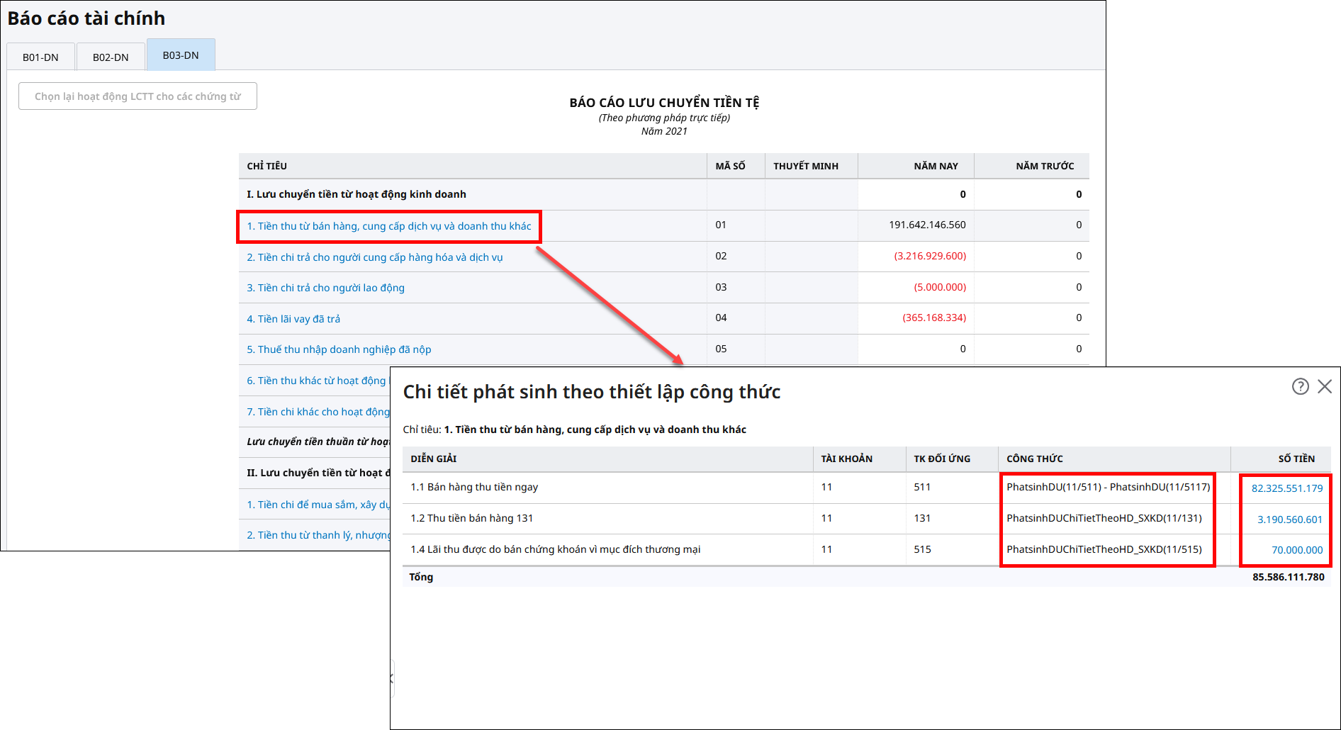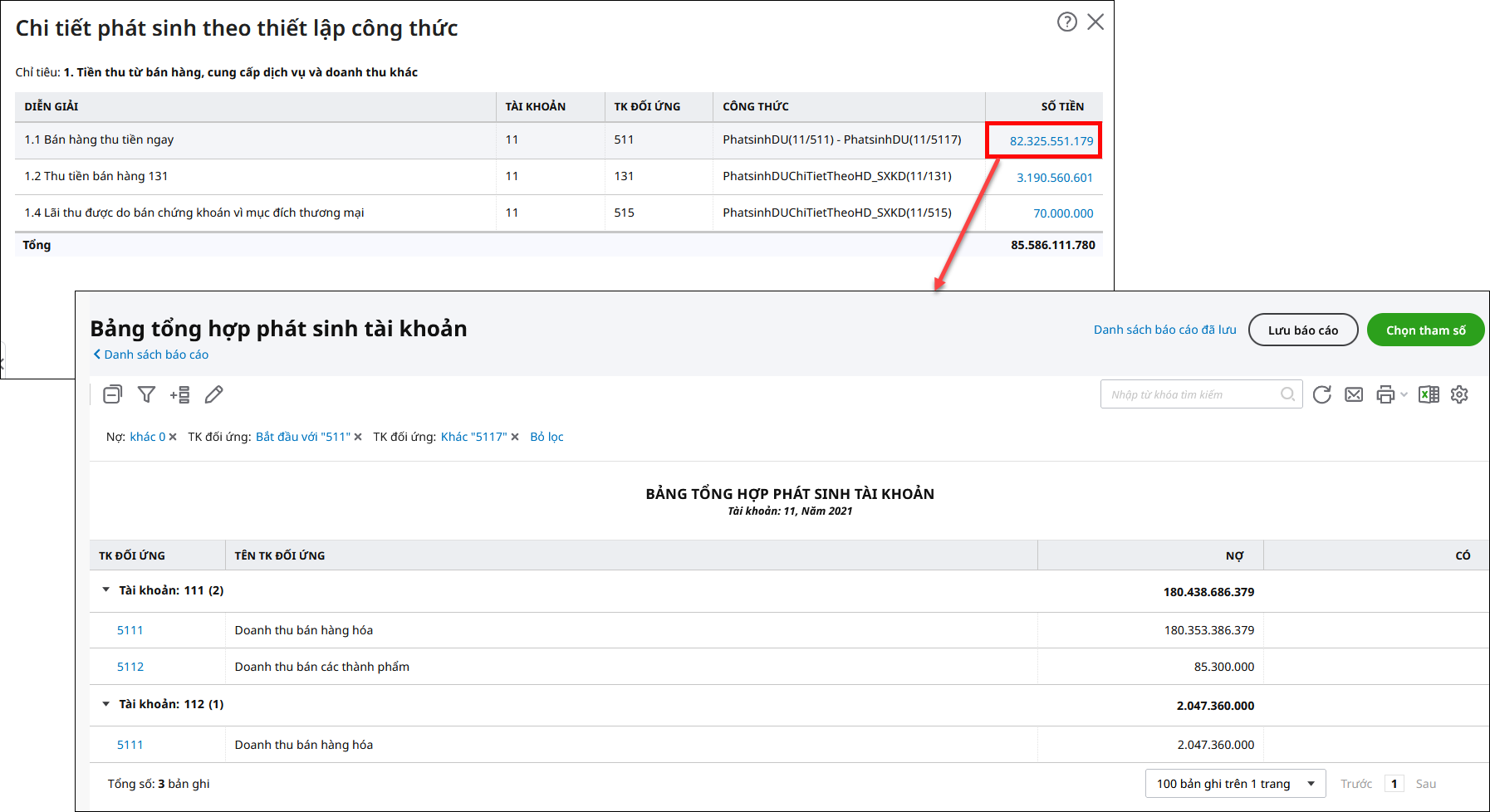 Bước 3: Để kiểm tra cách lấy số liệu của từng chỉ tiêu chi tiết, nhấn vào dòng Số tiền tương ứng: