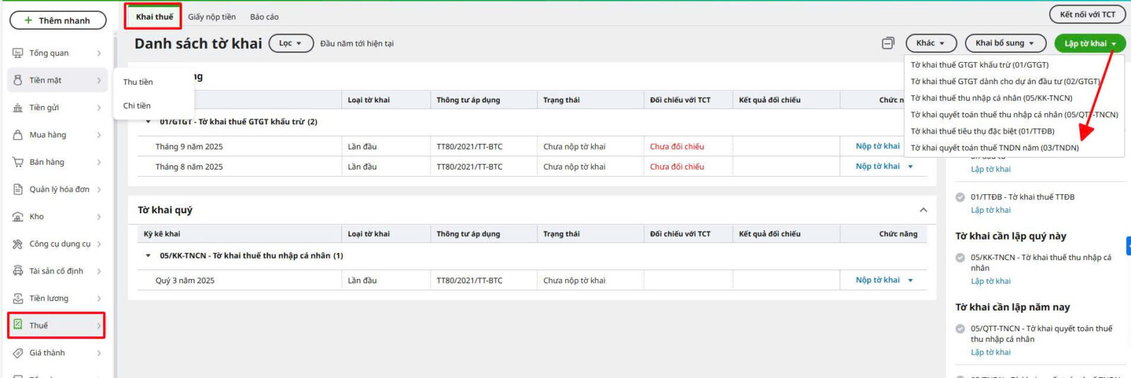 Bước 1: Vào phân hệ Thuế\tab Khai thuế\mũi tên ⏷ tại chức năng Lập tờ khai, chọn Lập tờ khai quyết toán thuế TNDN năm (03/TNDN).