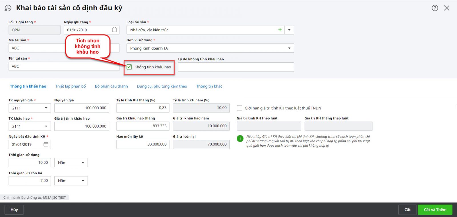 Bước 2: Tích chọn Không tính khấu hao và ấn Cất.