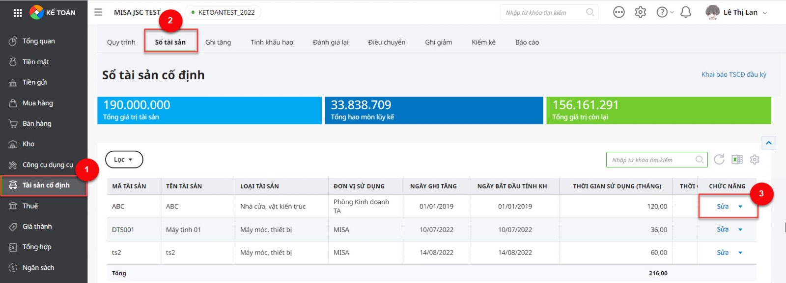 Bước 1: Vào phân hệ Tài sản cố định\ tab Sổ tài sản, chọn tài sản cần ngừng không tính khấu hao nữa, sau đó chọn chức năng Sửa.