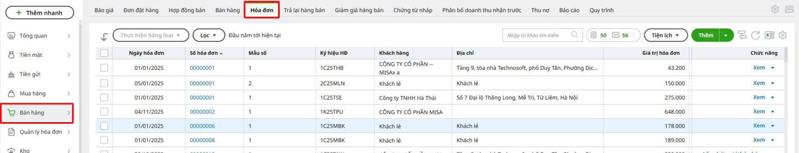 Bước 1: Vào phân hệ Bán hàng, chọn tab Hóa đơn.