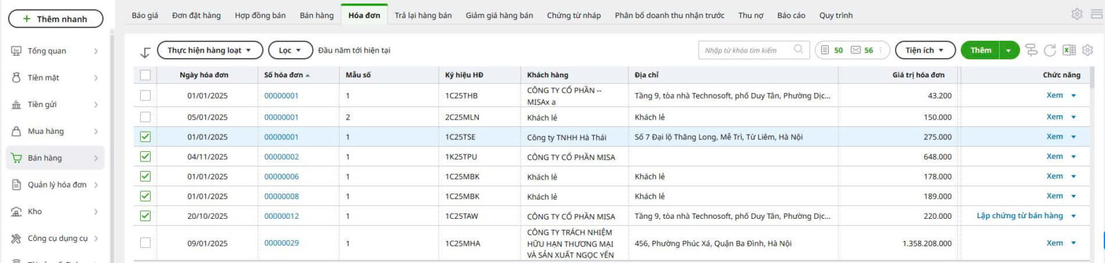 Lưu ý: Có thể tích vào ☐ trên cùng để chọn tất cả hóa đơn đang hiển thị trên trang.