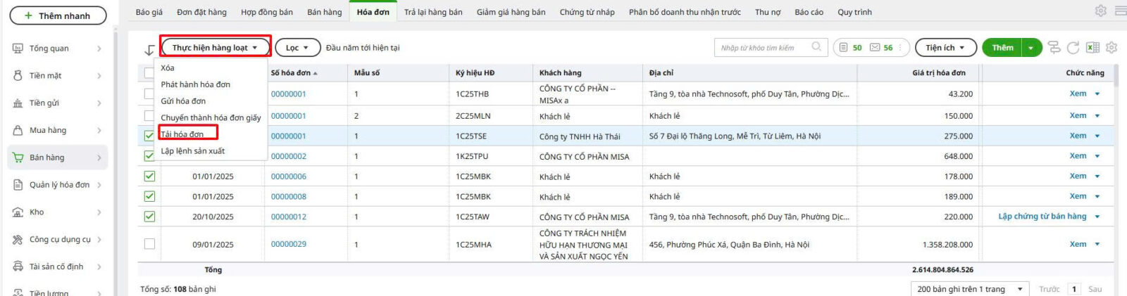Bước 3: Nhấn Thực hiện hàng loạt, chọn Tải hóa đơn.