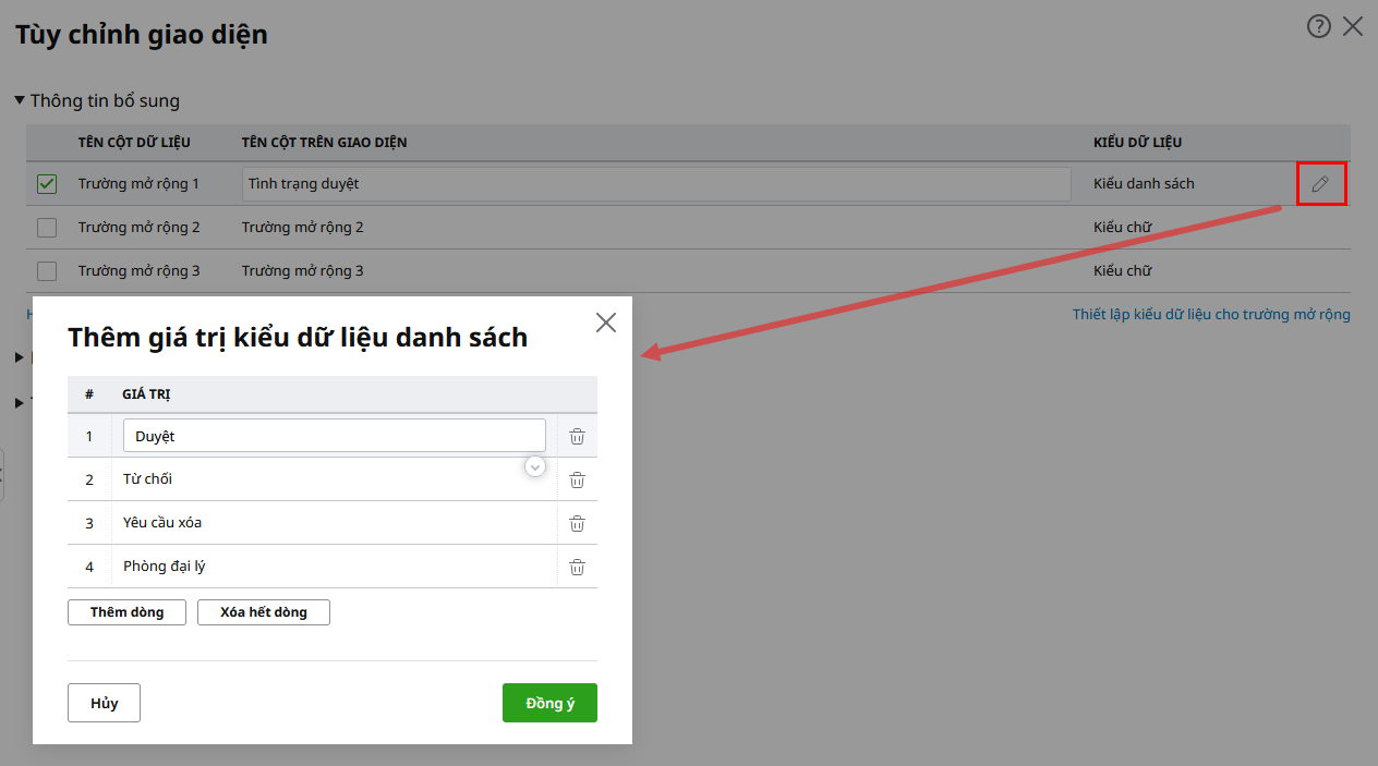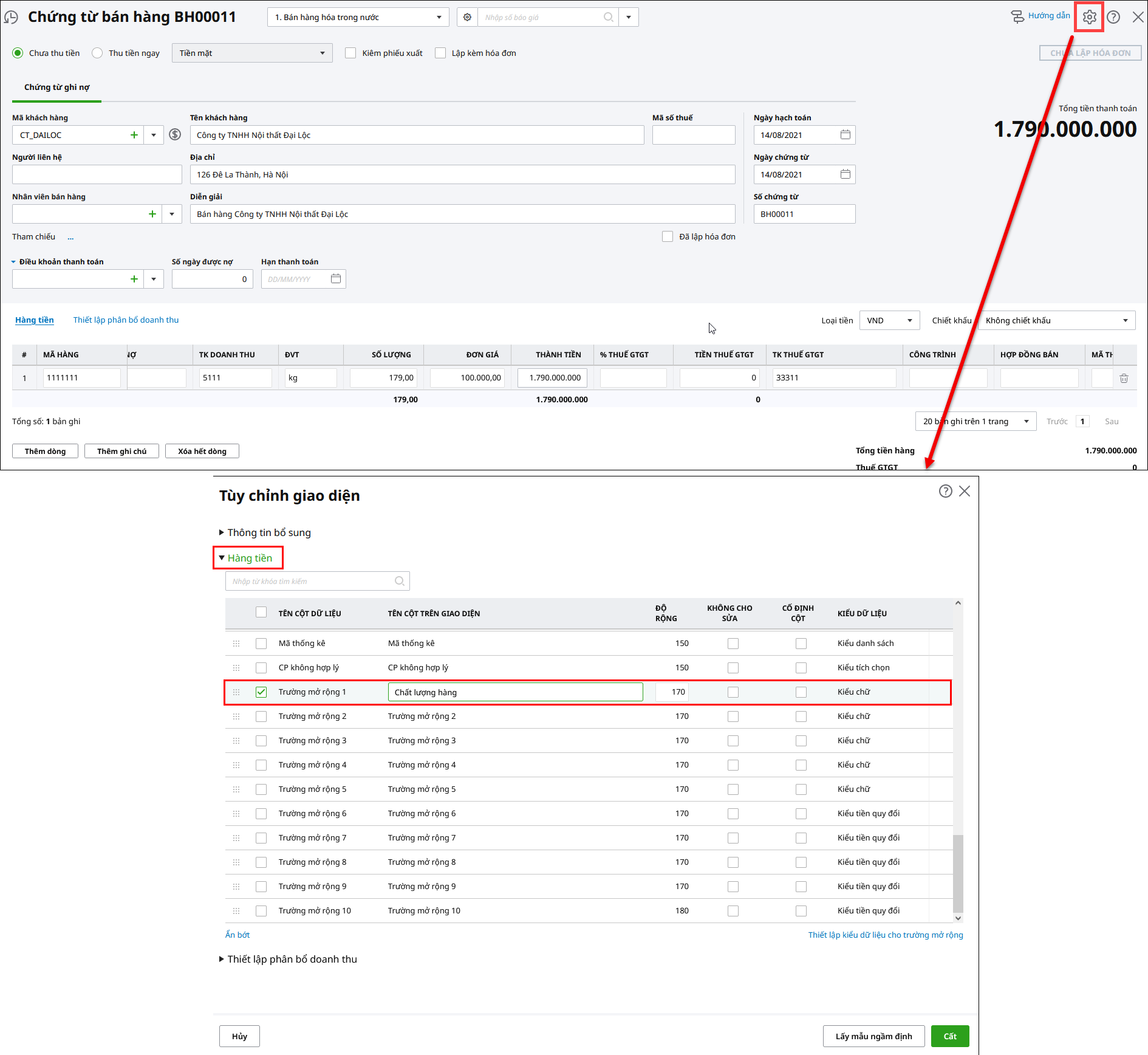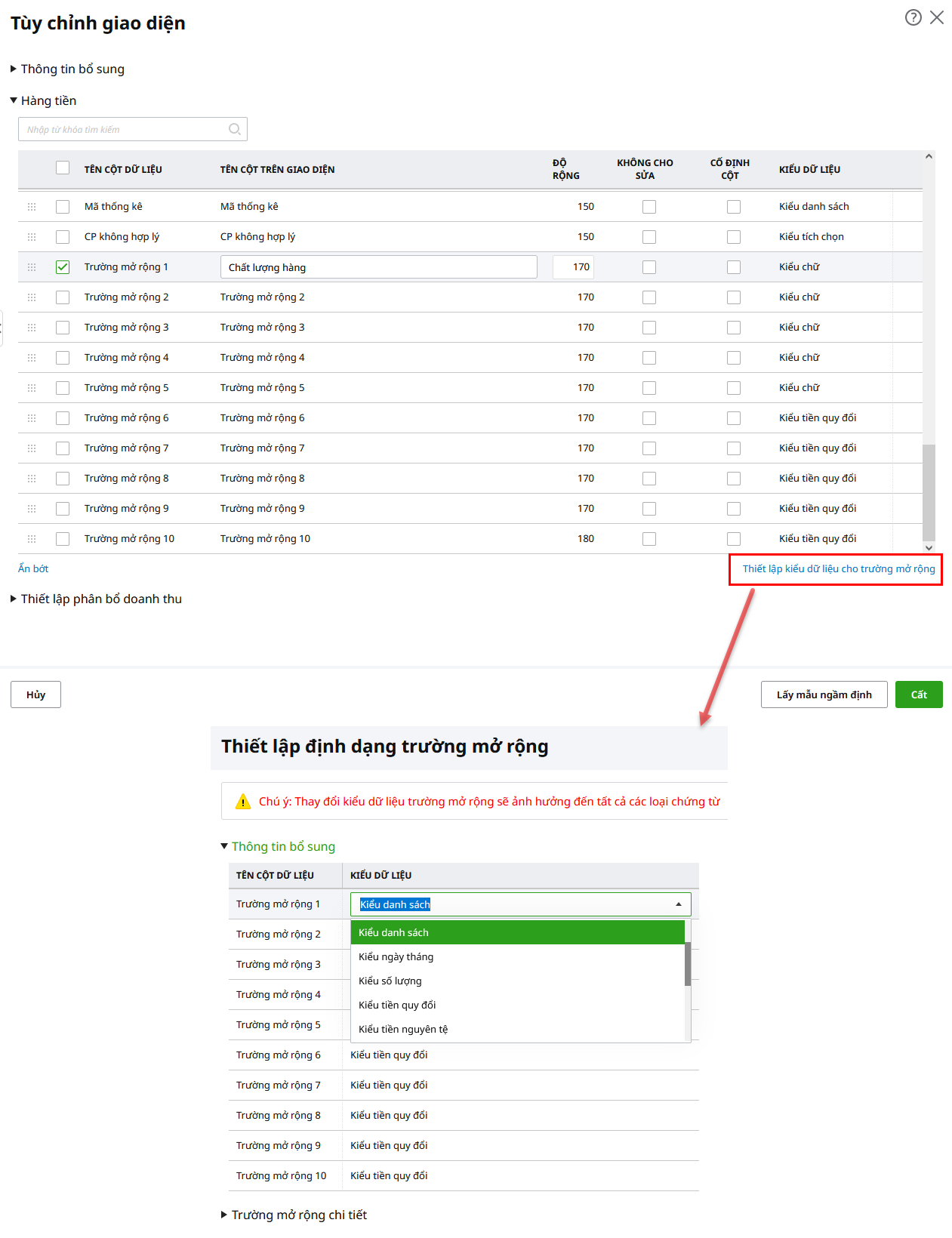 Lưu ý: Việc thiết lập kiểu dữ liệu cho trường mở rộng sẽ áp dụng chung cho tất cả các loại chứng từ trên dữ liệu.