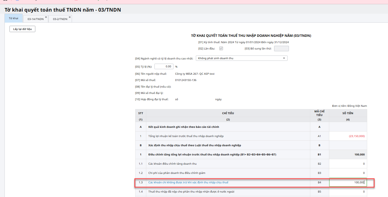 Bước 3. Tổng hợp chi phí không hợp lý lên chỉ tiêu B4 trên Tờ khai Quyết toán thuế thu nhập doanh nghiệp