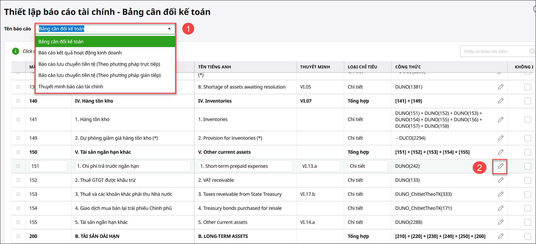 Bước 2: Lựa chọn Tên báo cáo cần thiết lập công thức. Bước 3: Tại chỉ tiêu cần thiết lập, cột công thức, chọn biểu tượng cây bút.