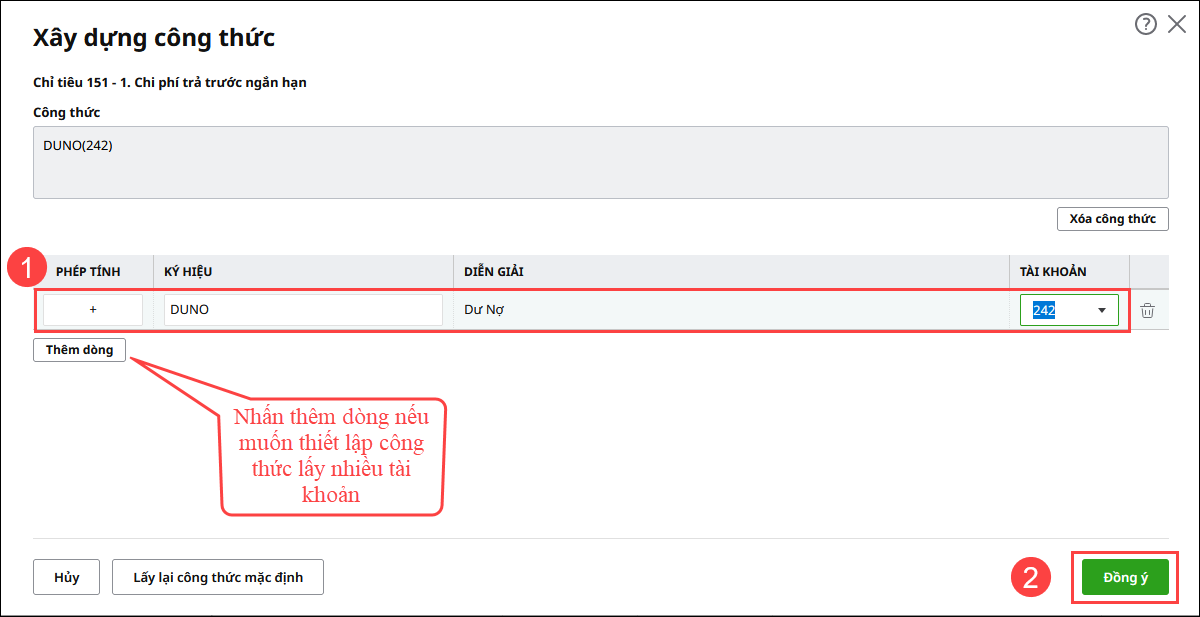 Bước 4: Thiết lập lại Phép tính, Ký hiệu, Tài khoản mong muốn. Bước 5: Nhấn Thêm dòng nếu muốn thiết lập công thức lấy nhiều tài khoản. Bước 6: Ấn Đồng Ý. Ấn Cất.