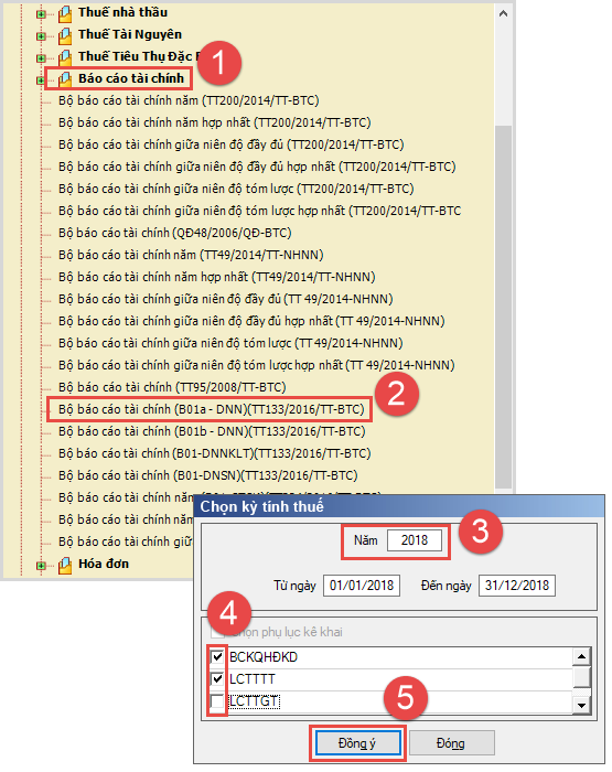 Bước 2: Chọn mục Báo cáo tài chính, chọn Bộ báo cáo tài chính tương ứng với Bộ báo cáo đã xuất từ phần mềm (cùng thông tư áp dụng, cùng kỳ kê khai, cùng báo cáo).