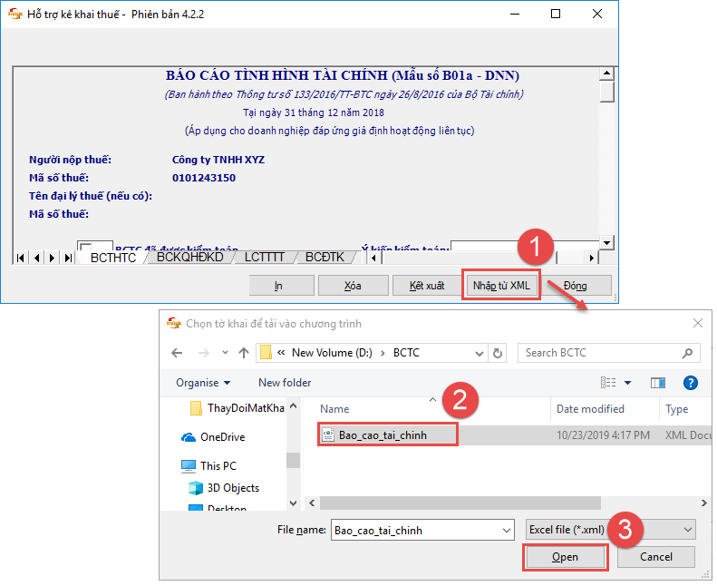 Có thể nhập khẩu file BCTC đã xuất khẩu ở trên vào phần mềm HTKK của Tổng cục thuế để lưu trữ (nếu cần) bằng cách: