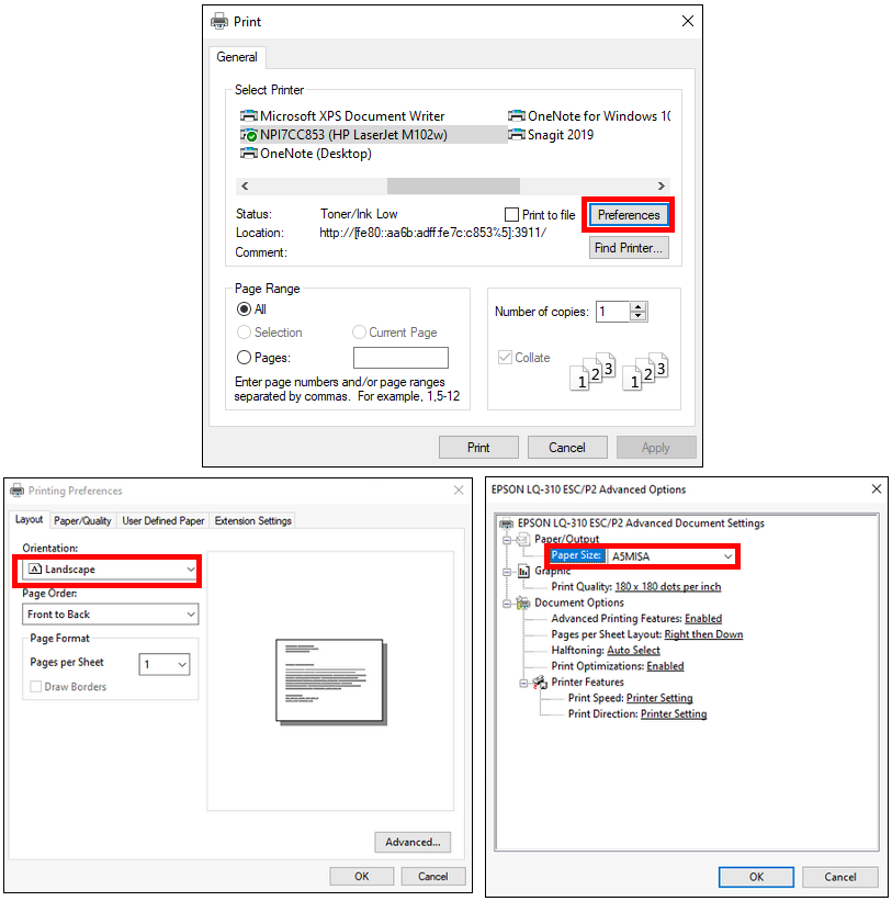- Lựa chọn Paper size là: form khổ giấy được tạo (ví dụ:A5MISA), chiều Landscape. Ấn OK để in.
